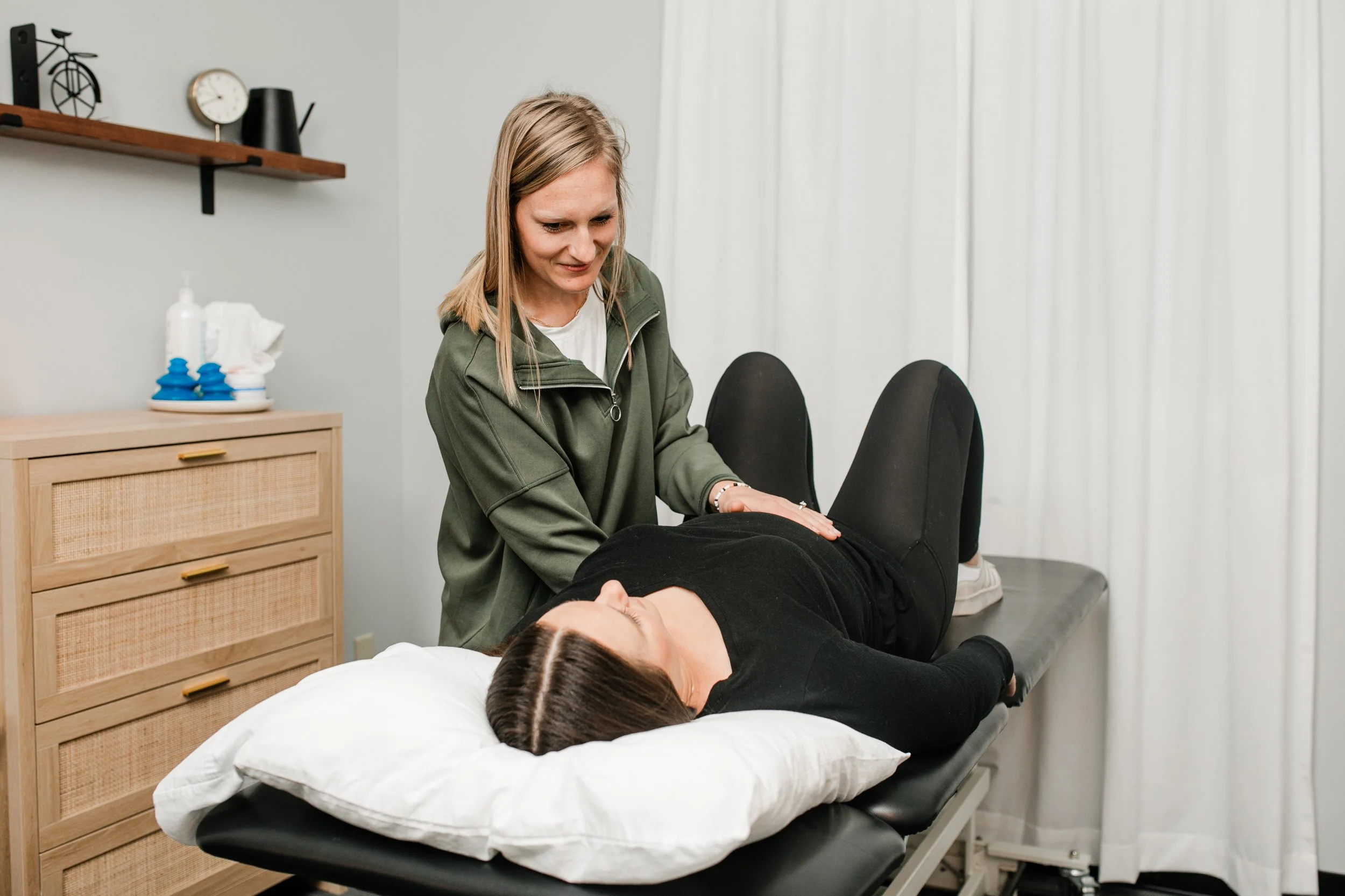 From there, they’ll assess how your core and pelvic floor are functioning. This may include checking posture, breathing patterns, abdominal engagement, and how your pelvic floor muscles contract and relax. With your consent, they may also perform an internal exam to evaluate muscle tone, strength, scar tissue, and overall pelvic floor health. Everything is done at your pace, with clear communication and no pressure.